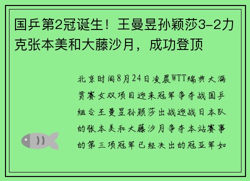 体坛周报全媒体记者 李婷男单世界第一和女单世界第二在横滨冠军赛双双无缘八强,算爆冷吗?单从比赛进程的结果来看,似乎是的。但如果从对手的实力和当今世界乒坛的格局来看,林诗栋和王曼昱分别不敌欧洲名将邱党和国乒新锐陈熠,其实是谈不上爆冷的,当大家都在进步的时候,“领头羊”们也需要做好更多的细节,方能继续巩固自身的位置。WTT横滨冠军赛今天全面进入到第二轮的争夺,男单方面,王楚钦3比0完胜韩国选手吴晙诚晋...